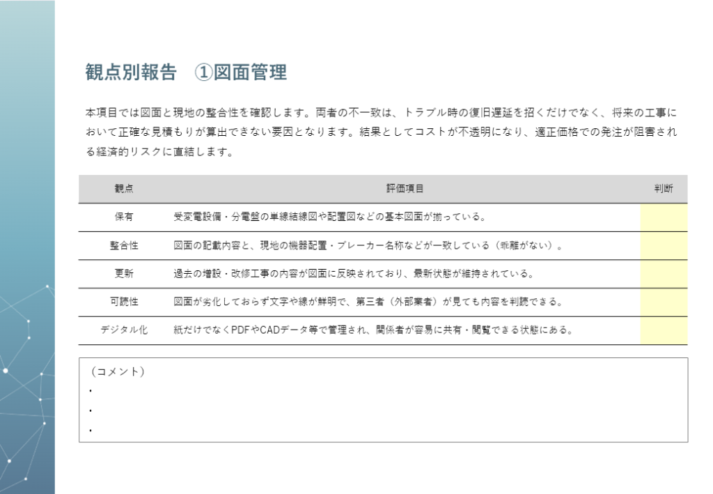 「どこから手をつければいいかわからない」という状態から、優先順位を明確にした「次に取るべき行動」がわかる状態へ。電気設備のトラブルは大きな事故に直結するからこそ、プロの視点による改善提案を将来の安定運用のための羅針盤としてご活用ください 。