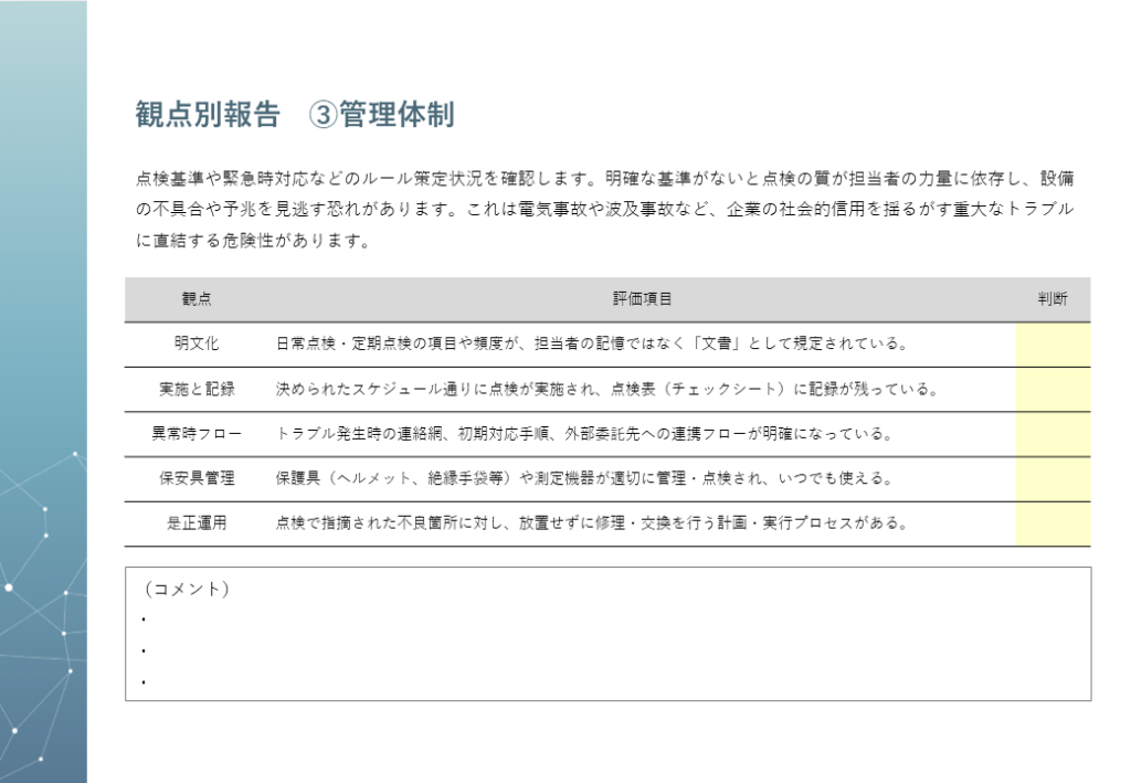力道電設では、電気設備の管理状況を客観的に把握していただくことを目的としたアセスメントサービスを提供しています。人手不足や技術継承の困難さといった現代の課題を解決するために企画されたサービスです。当社のスタッフが客観的な視点で貴社の管理実態を調査し、具体的な課題点と改善策をレポートにまとめます。